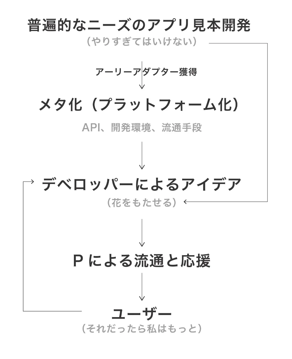 プラットフォーマーになりたいからといって、プラットフォームから作ると失敗しがちです。まずはDとUの関係の構築が重要になります。まずは、自分たちも欲しいと思える、魅力的なUXを持つアプリケーションを制作しそれにアーリーアダプターなり、リードユーザーなりのユーザーがついたら、その後にそのユーザー自身がアレンジできるようなパーソナライズ機能をはじめ、さらにもっと使い方を広げるためのAPI公開といった順番で設計を試みるのがよいでしょう。大企業の場合はすでにある主力自社製品をメタ化してしまうのも良いでしょう。